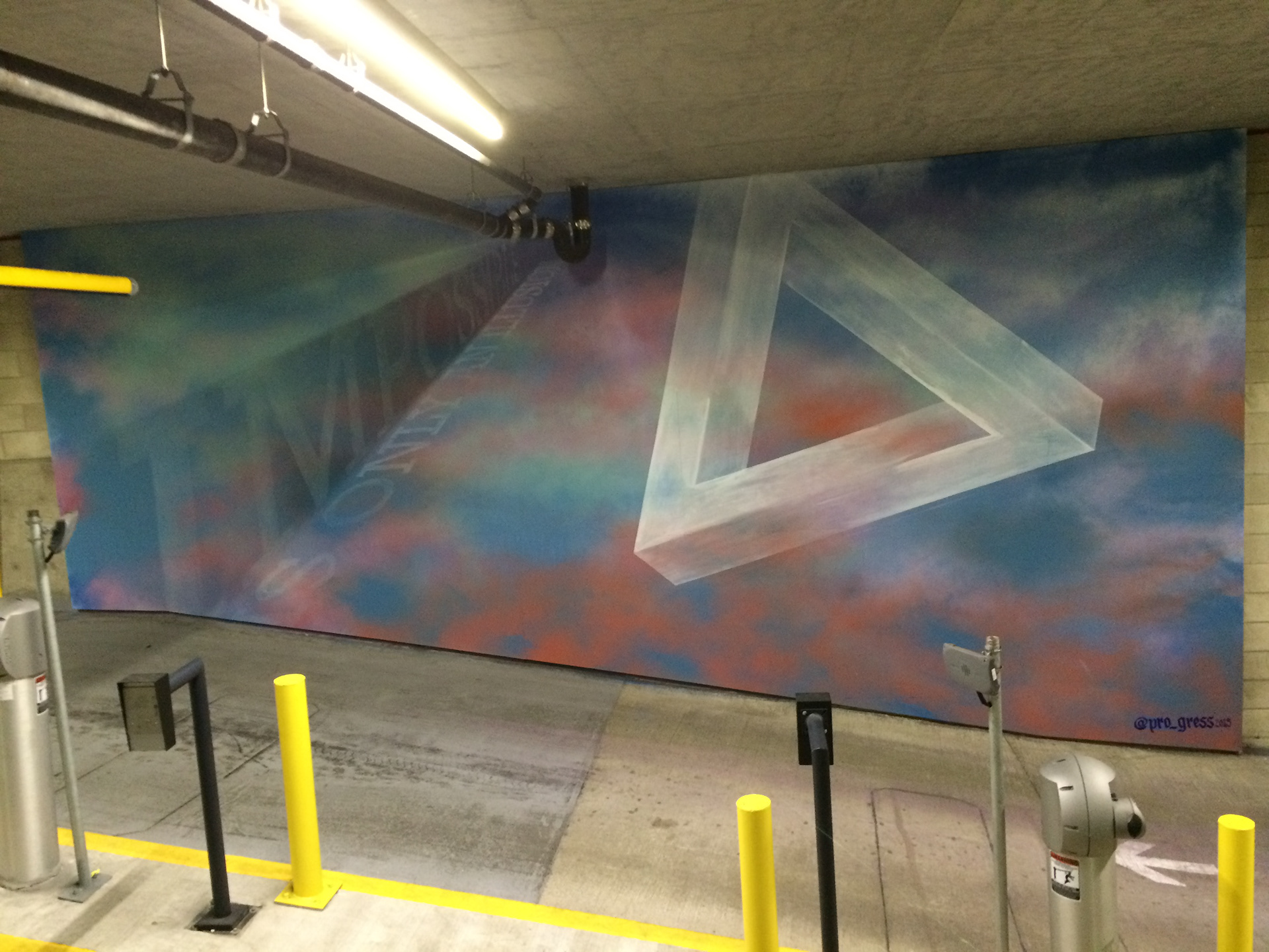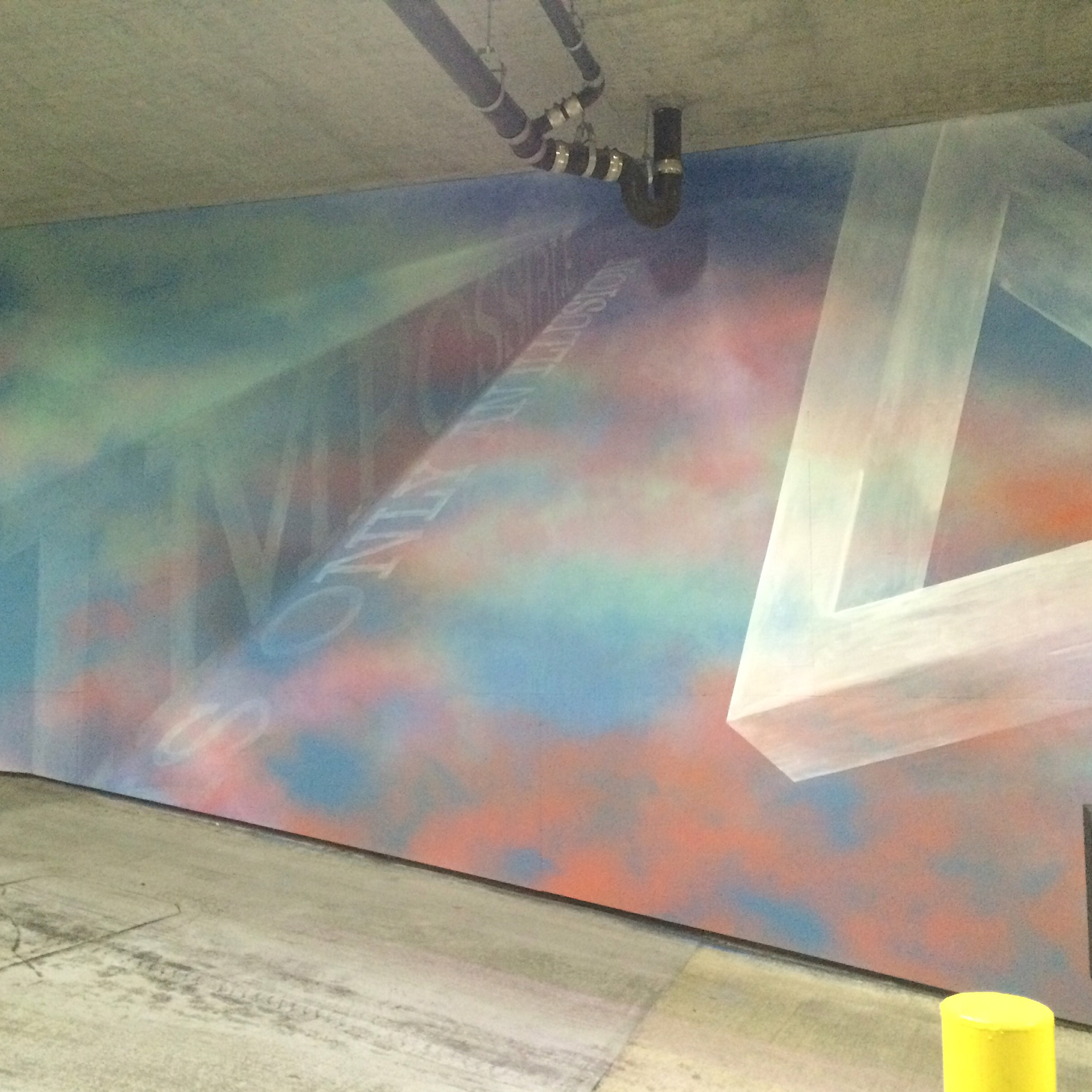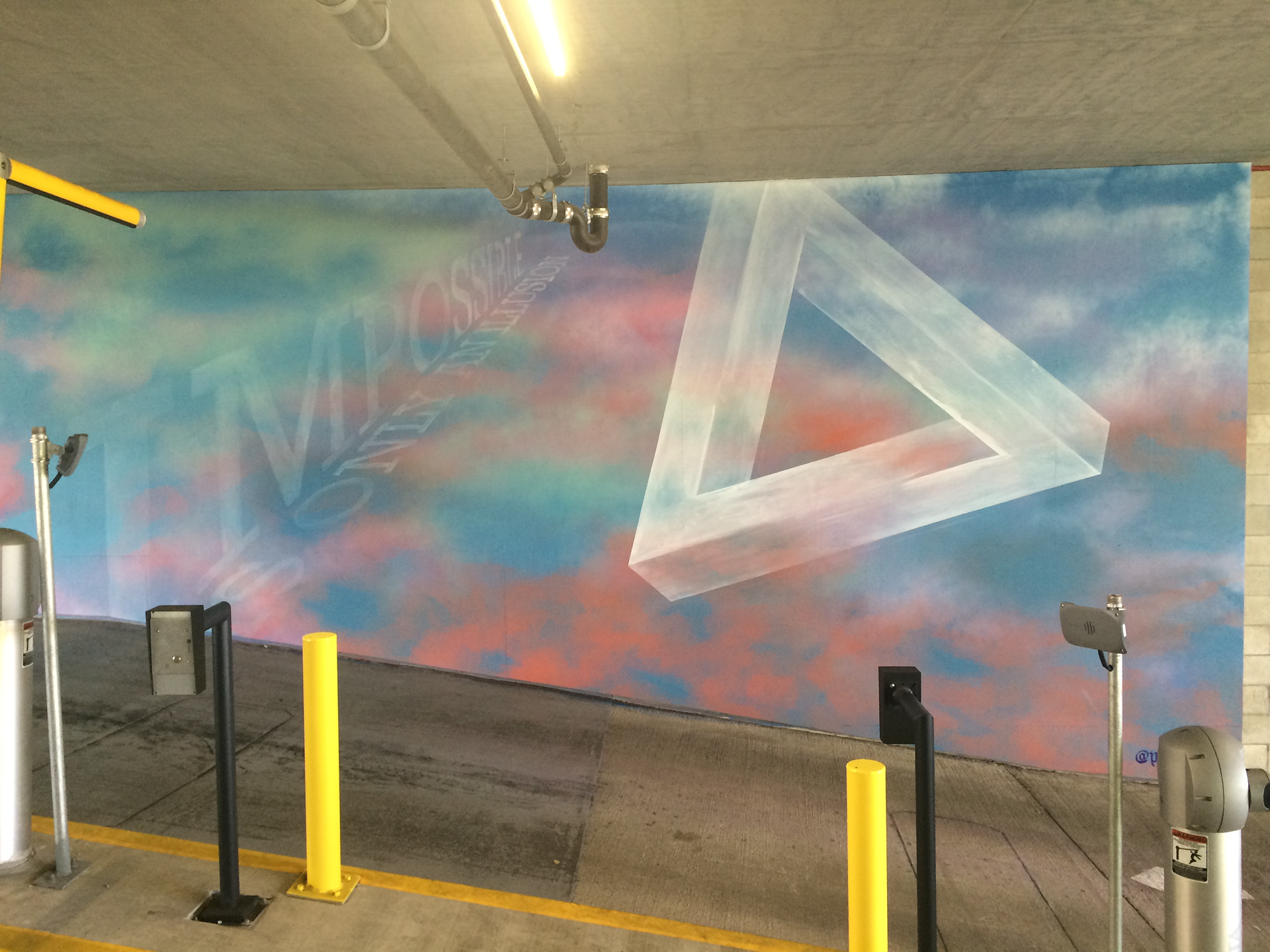 Mural for Halekauila Apartments parking garage in Honolulu. "Impossible is only an illusion" text sets into the cast shadow seen only between dusk and dawn.